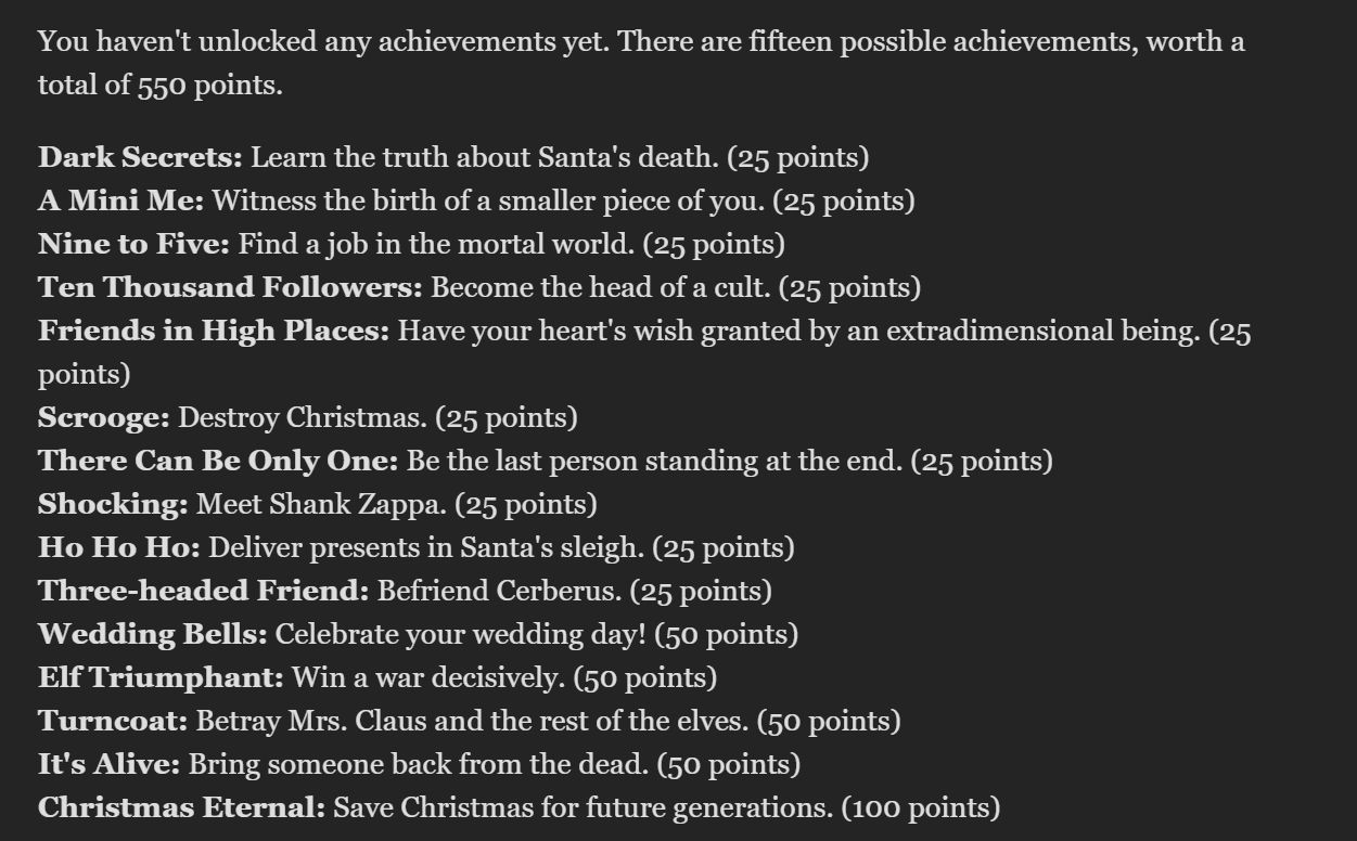 Since choices matter for the story and character progression, In the Service of Mrs. Claus provides a great amount of replayability. Best of all, since the entire game is text-based with no music or sound, one can play through the entire story, and then try again with the intention of using a different type of character for a new experience. As stated, the game has over 167,000 words, and by comparison, that makes it slightly shorter than words of fiction like Dune by Frank Herbert at 188,000 words, or close to Harry Potter and the Half-Blood Prince by J.K. Rowling, at just under 169,000 words.