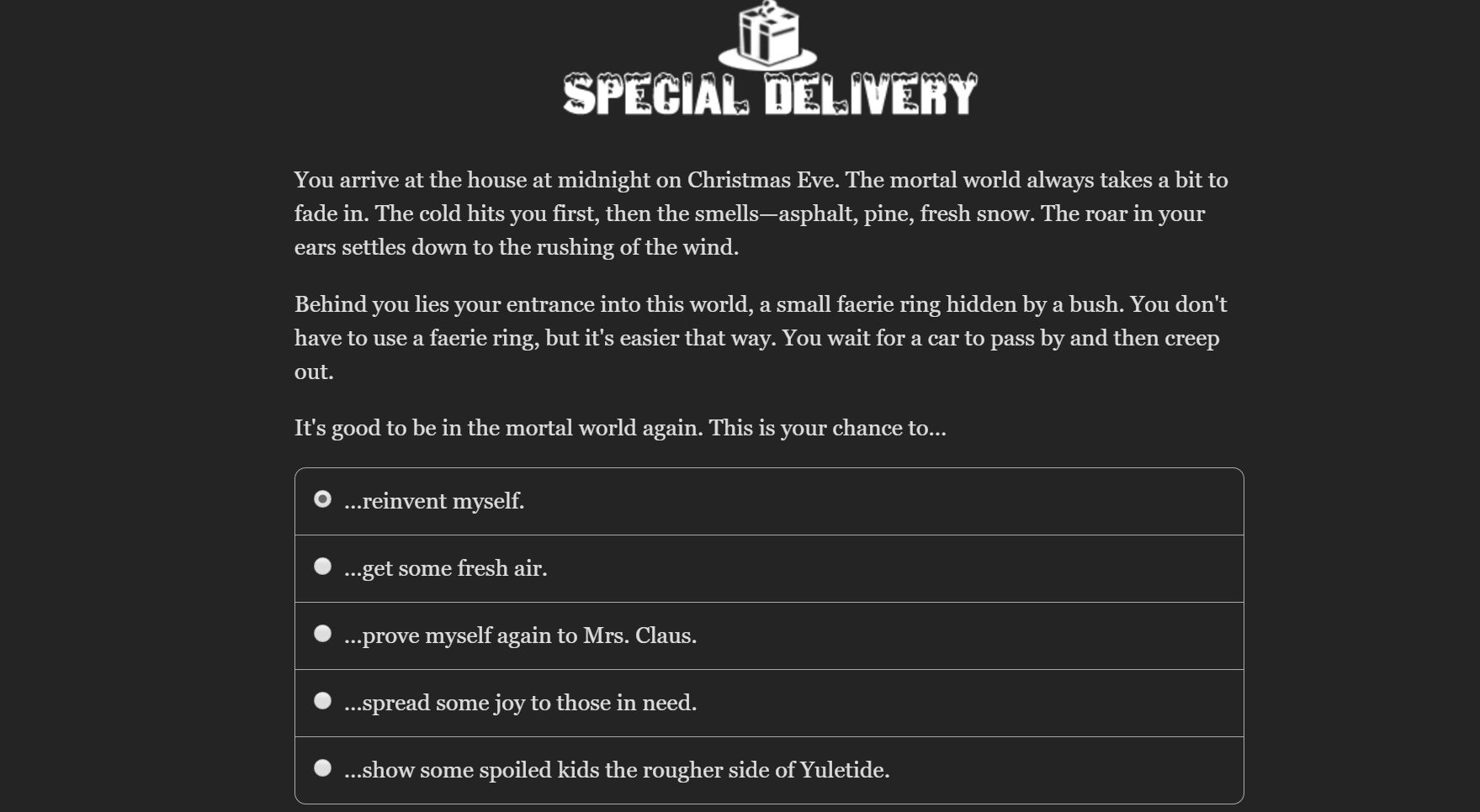 Unlike the traditional Choose Your Own Adventure books, or even other works of interactive fiction, In the Service of Mrs. Claus often provides many options for how to proceed with the story, even in the most mundane of situations. It is not clear which of these choices ultimately impacts the long-term progression through the story, though there are occasions where one choice clearly takes you down a completely different path.